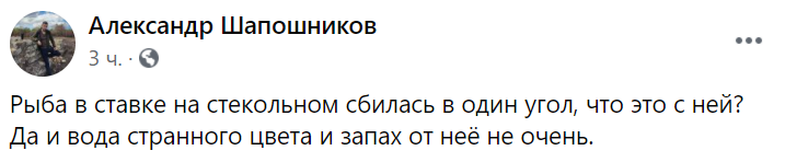 За словами автора поста, риба в ставці збилася в один кут. Викликає занепокоєння і колір води, і її неприємний запах.