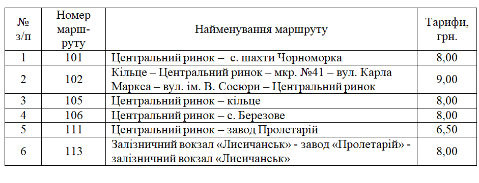 Згідно з розпорядженням, встановлюються нові тарифи на послуги з перевезення пасажирів на автобусних маршрутах загального користування, які надаються комунальним підприємством Лисичанської міської ради "Електроавтотранс": маршрути №№ 101, 102, 105, 106, 111, 113.