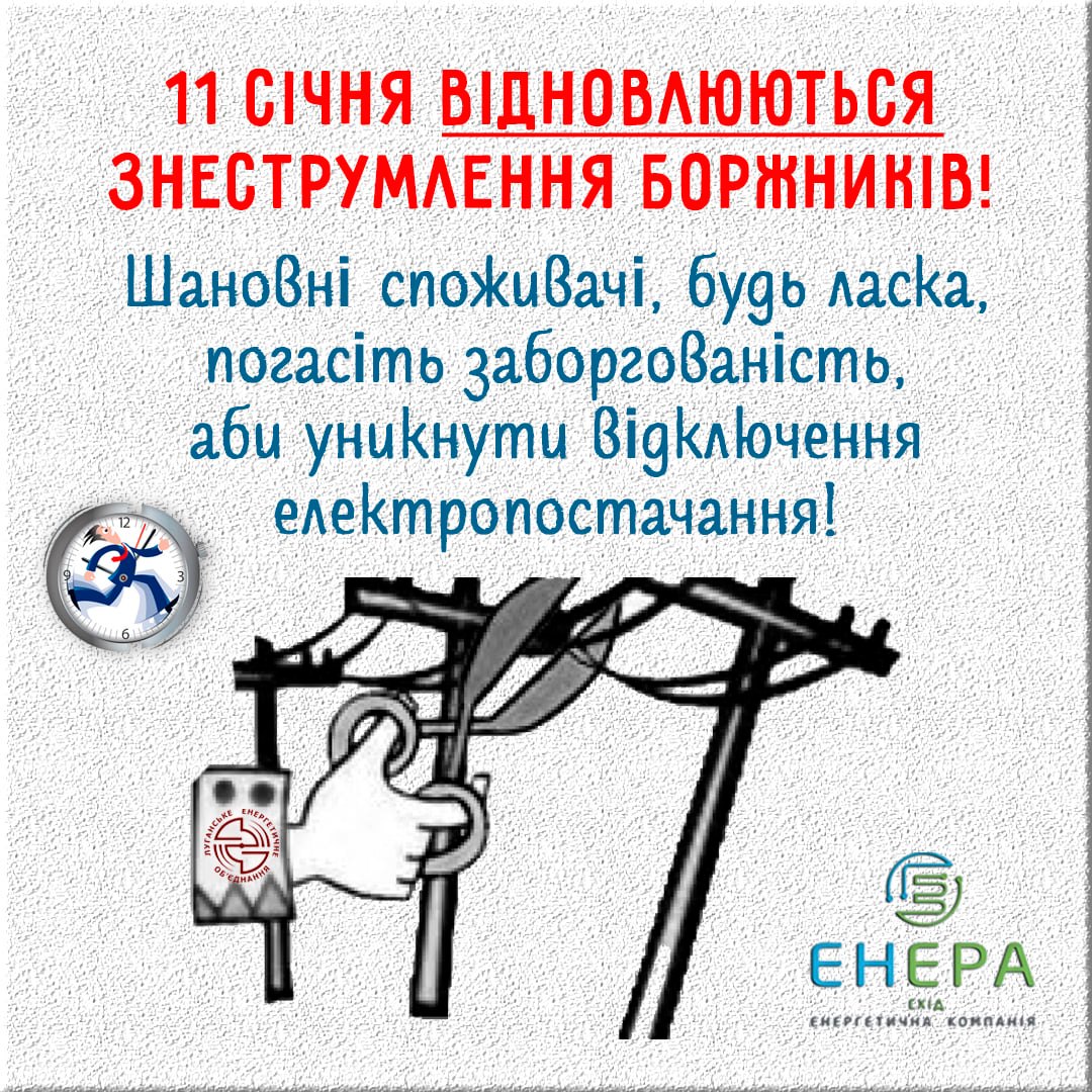 З 11 січня у Луганській області відновлюються знеструмлення боржників за електроенергію. Громадян закликають не зволікати та сплачувати рахунки вчасно.