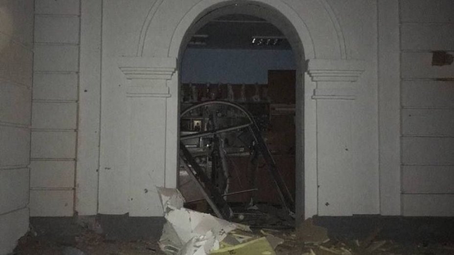 На фотографіях і відео, які опублікував Антон Геращенко, видно, що частина стіни Святогірської лаври в Донецькій області зруйнована. Крім цього, від удару вилетіли вікна та двері.