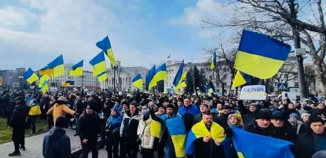 О 10.00 на площі Свободи в Херсоні десятки людей, озброївшись плакатами та українськими прапорами, провели мітинг. Вони вигукували гасла "Херсон – це Україна" та "Слава Україні".