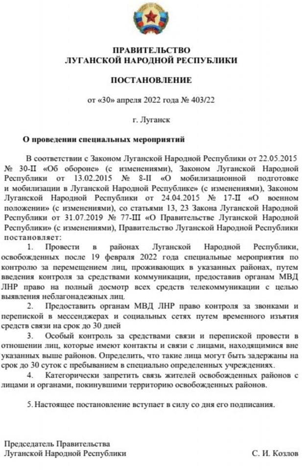 Передбачається, що в районах Луганщини, які окупанти захопили з 19 лютого 2022 року, будуть проводитись "спеціальні заходи щодо контролю за переміщенням осіб, які проживають у зазначених районах, шляхом введення контролю за засобами комунікації, надавши органам МВС ЛНР право на повний огляд усіх засобів телекомунікації з метою виявлення неблагонадійних осіб".