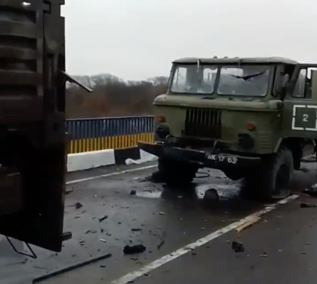 "Відео ще перших днів війни, яке раніше не публікувалося. Розбита російська колона на мосту у місті Щастя Луганської області", - підписав Казанський.