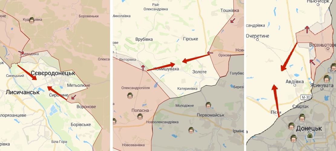 Експерти вважають, що російські окупанти, ймовірно, намагаються домогтися одночасного оточення кількох невеликих осередків українських сил у Донецькій та Луганській областях: ширший район Сєвєродонецька (включаючи Рубіжне та Лисичанськ), Бахмут-Лисичанськ, навколо Золотого (на північний схід від Попасної) та навколо українських укріплень в Авдіївці.