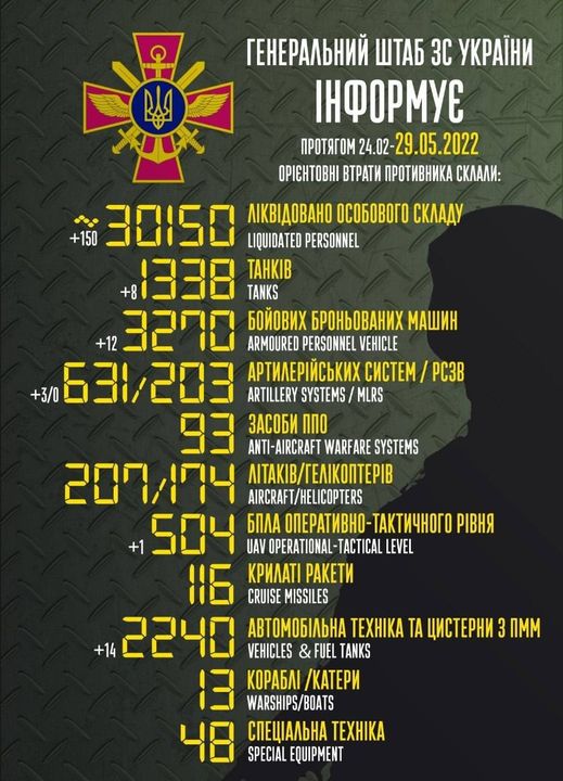 Загальні бойові втрати противника з 24.02 до 29.05 орієнтовно склали: