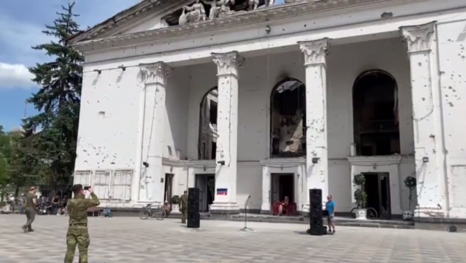 Музика. Фотографуючі руйнування російські військові та посадовці. Люди в черзі за гуманітаркою. І нескінченні відео про “покращення” з вірного ракурсу спиною до руїн Драмтеатру.