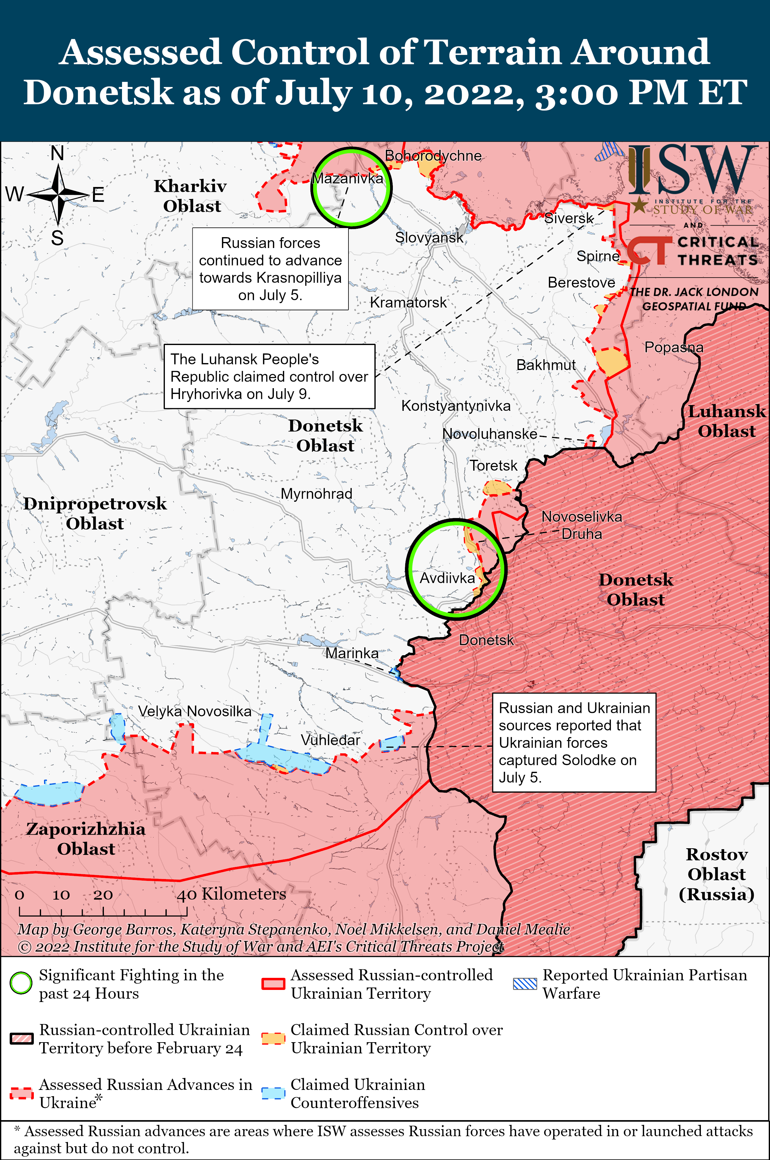 "Війська РФ 10 липня провели низку розвідувальних операцій на північний захід від Слов'янська, в районі Долини й Мазанівки, для виявлення слабких місць в обороні ЗСУ. Також російські сили провели обмежену атаку у 25 км на північ від Донецька", - йдеться у повідомленні.