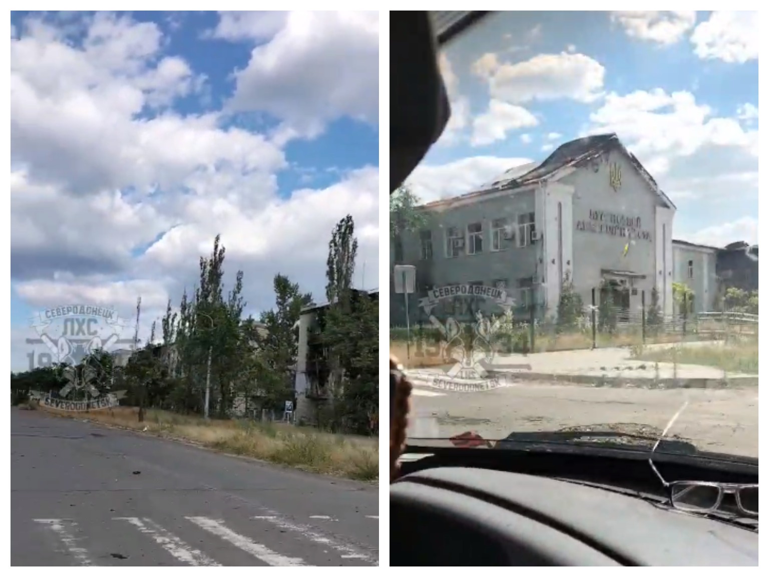 Ці відеоролики наочно демонструють, наскільки катастрофічні руйнації у Сєвєродонецьку. Рідкісним будівлям пощастило вціліти. Зокрема, на відео видно зруйновані будівлі апеляційного суду, драмтеатру, безліч житлових будинків.