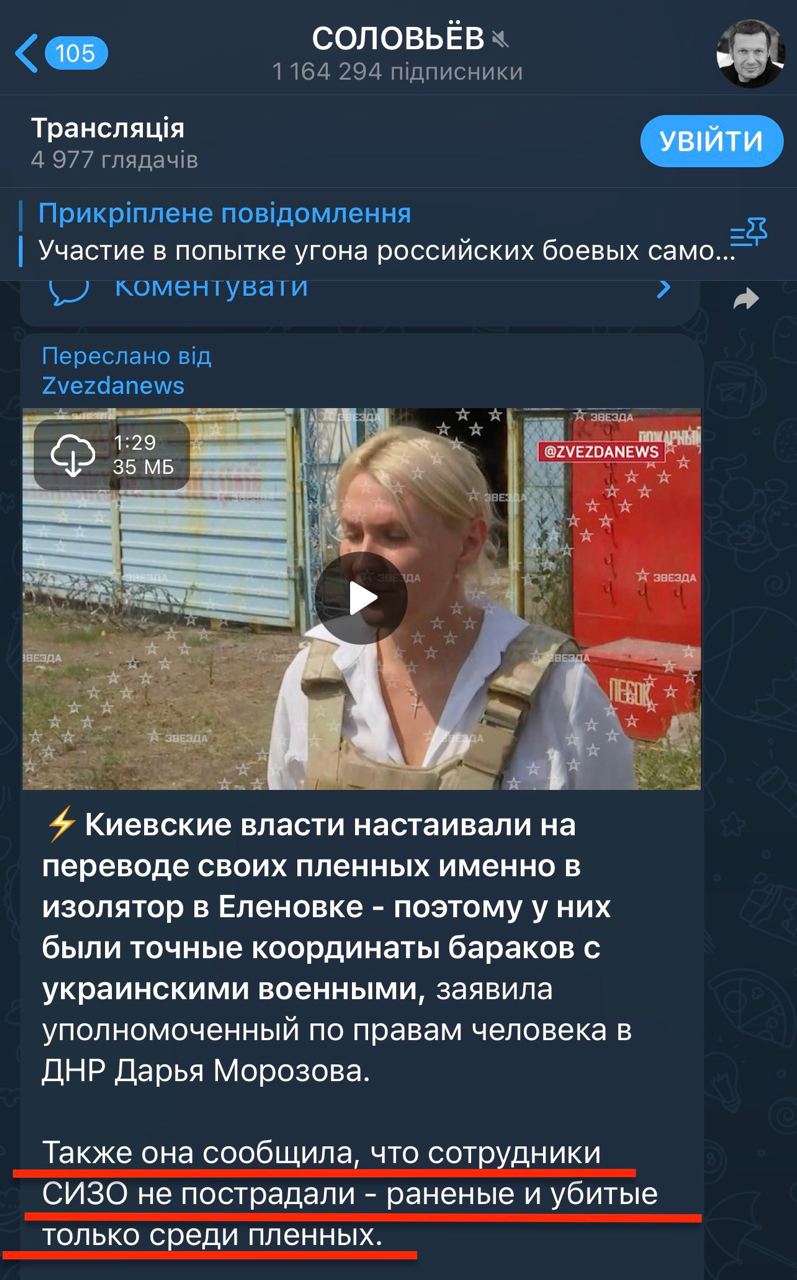 "Служба безпеки України перехопила телефонні розмови, в яких окупанти підтверджують, що саме російські війська винні в цій трагедії. Таким чином, навіть бойовики т.зв. "ДНР" не вірять у брехню російської пропаганди про те, що "обстріл" виправної установи в Оленівці здійснила Україна", - йдеться у повідомленні.