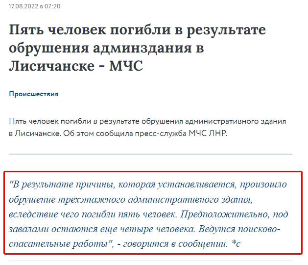 Він додав, що "нарешті з'ясувалося, що трапилося з будівлею СБУ в окупованому Лисичанську, де проходила нарада окупантів. Виявляється, сталося обвалення)".