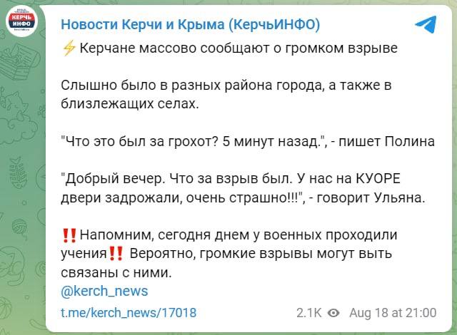 В окупованій Керчі сьогодні, 18 серпня, увечері були чутні сильні вибухи. Що стало причиною - поки що невідомо.