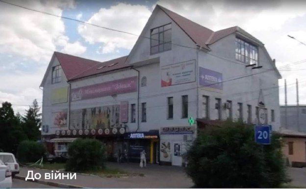 У мережі з'явилися фото невеликого торговельного центру в Макарові, який було зруйновано під час бойових дій на Київщині у перші тижні російського вторгнення.
