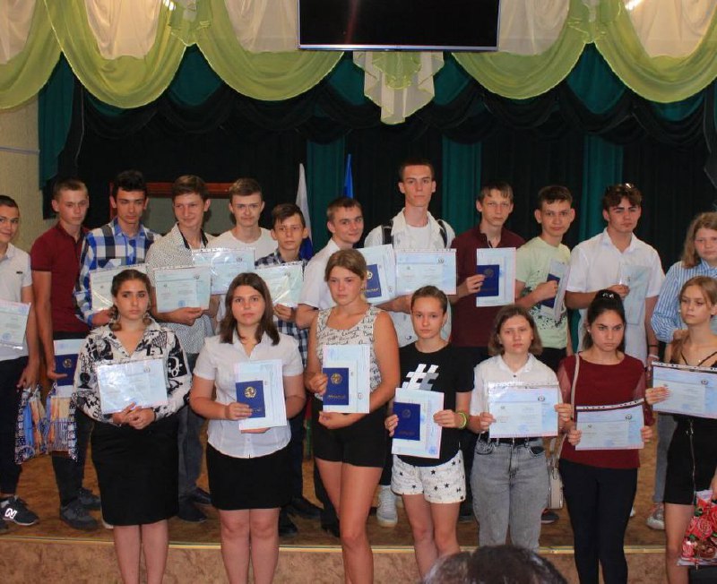 Окупанти також подарували дітям ще пропагандистські прапорці, грамоти та "антифашистську" літературу. На фото зображено випускників у звичайному літньому одязі, при цьому емоції на обличчях підлітків далекі від радісних.