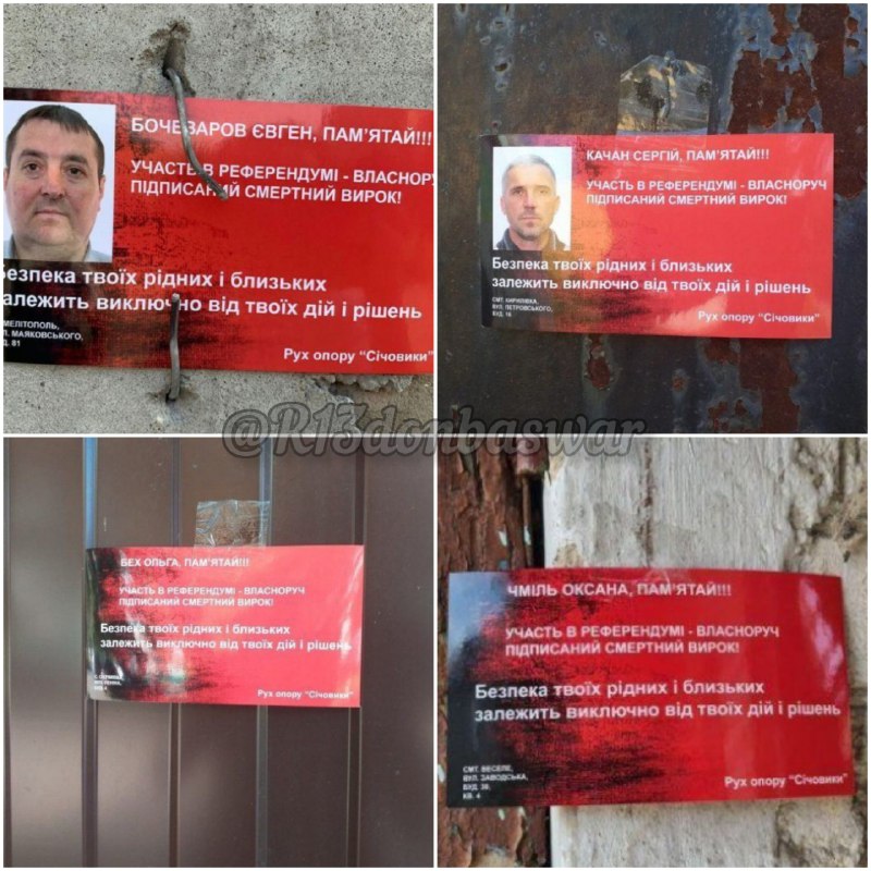 По всьому місту та району підпільники розклеїли листівки з фотографіями зрадників та попередженням: "Участь у референдумі - власноручно підписано смертний вирок! Безпека твоїх рідних та дітей залежить виключно від дій та рішень".