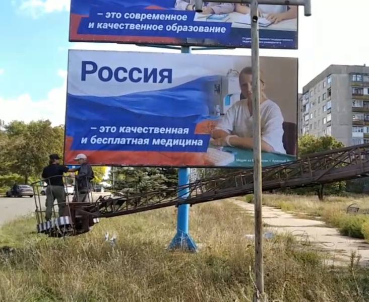 Як видно, по Лисичанську розвішали рекламні щити із запевненнями про те, що Росія - це "сучасна та якісна освіта", "якісна та безкоштовна медицина", "історія, яку не можна скасувати" і т.д.