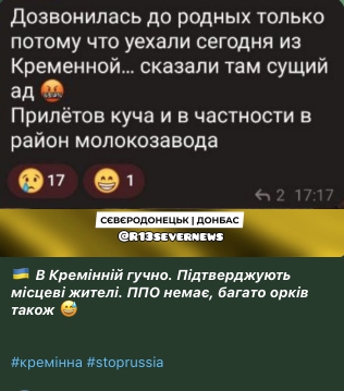 За інформацією місцевих жителів, у Кремінній відбувається "суще пекло", багато прильотів. ППО, за даними Telegram-каналу, у окупантів немає.