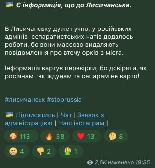 За інформацією Telegram-каналу, у Лисичанську зараз дуже гучно, окупанти тікають з міста. Однак адміністратори сепаратистських чатів видаляють повідомлення про реальний стан речей.