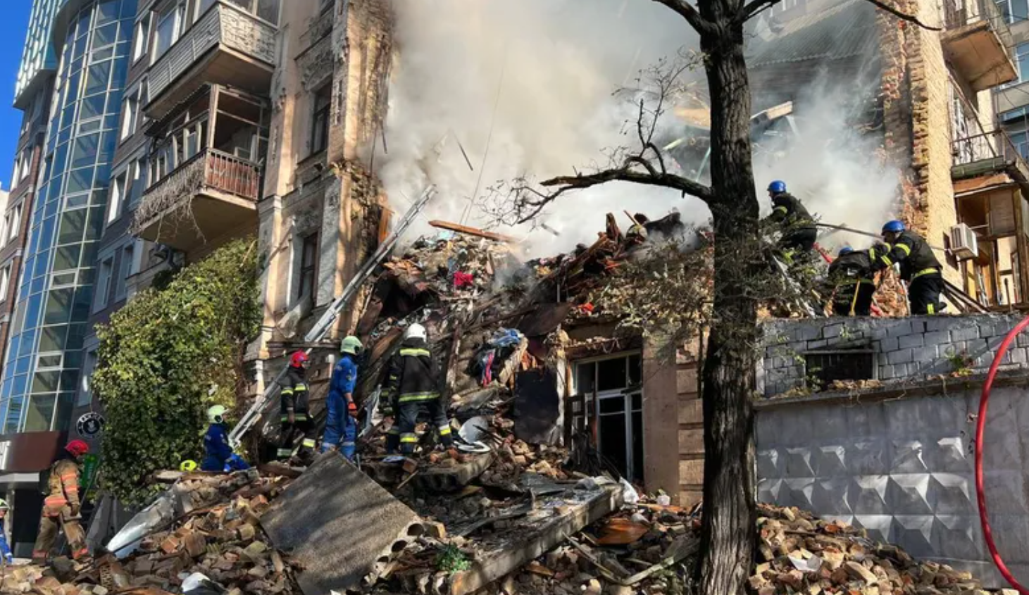 Внаслідок ранкової атаки дронів-камікадзе зруйновано багатоповерхівку у Києві. З-під завалів будинку дістали тіло першої жертви.