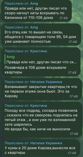 За словами користувачів соцмережі, які так чи інакше одержують інформацію з міста від знайомих, у Лисичанську окупанти продовжують розкривати квартири та виносити все цінне, що було у людей. Також страждають квартири, які розташовані на перших поверхах, де просто вибивають вікна.