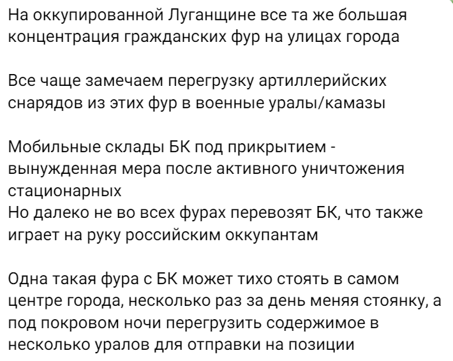 "По фурах в Алчевську та Луганську. Стоять у різних частинах міста. Від очевидців інфа, що вночі в комендантську годину під'їжджають урали та КамАЗи, і БК перевантажується з фур у них".