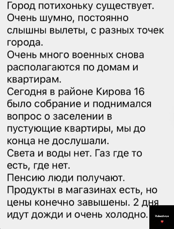 Також повідомляють, що у місті дуже галасливо. У квартирах немає світла та води, і дуже холодно.