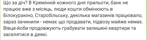 "У Кремінній щодня прильоти, банк не працює вже місяць, люди кошти обмінюють у Білокуракине, Старобільську, кілька магазинів працювало, зараз закрили - нічого продавати, підвезення майже немає. Окупанти продовжують грабувати залишені квартири та заселятися в деякі", - пишуть у мережі.