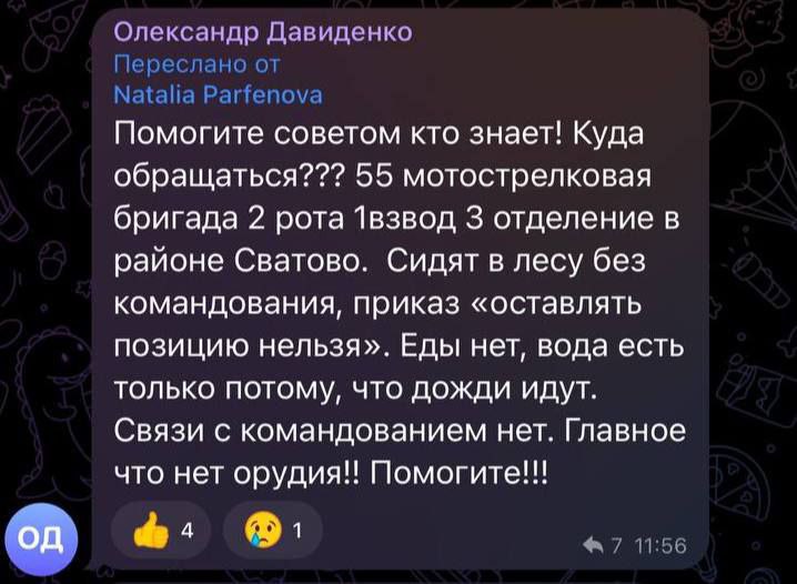 "Допоможіть, куди звертатися? 55 мотострілецька бригада сидить у лісі в районі Сватове без зброї, їжі та зв'язку. Вода є тільки тому, що дощі йдуть", - скаржаться окупанти.
