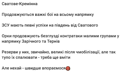 Як повідомляв голова Луганської ОВА Сергій Гайдай, поблизу Сватового та Кремінної росіяни накопичили велику кількість особового складу. "Але, попри це, ЗСУ просуваються вперед і має успіх на півдні від Сватового".