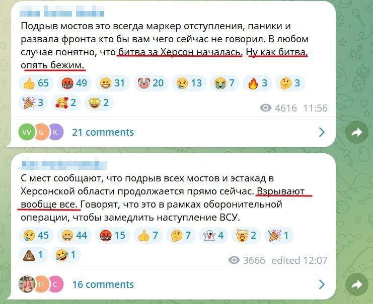 "Підрив мостів це завжди маркер відступу. У будь-якому випадку зрозуміло, що битва за Херсон почалася. Ну як битва, знову біжимо", - пишуть у мережі.