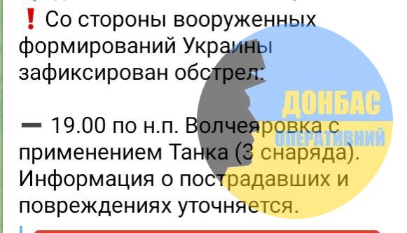 "З боку збройних формувань України зафіксовано обстріл: 19.00 до н.п. Вовчоярівка із застосуванням танка (3 снаряди). Інформація про постраждалих та пошкодження уточнюється", - пишуть у росЗМІ.