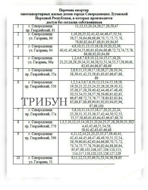 Черговий список квартир у Сєвєродонецьку, які окупанти збираються зламувати чи вже це зробили без згоди власників.