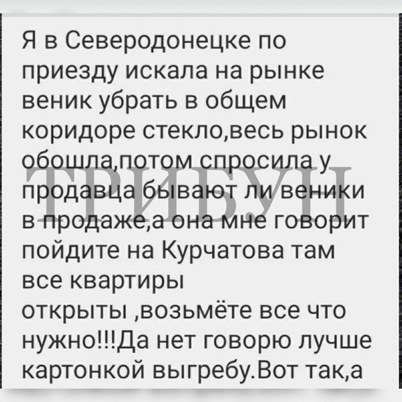 "Я у Сєвєродонецьку шукала на ринку віник, щоб прибрати скло у загальному коридорі. Весь ринок обійшла, потім запитала у продавчині, чи бувають віники у продажу. А вона мені каже: "Ідіть на Курчатова, там усі квартири відкриті, візьмете все, що треба". Та ні, кажу, краще картонкою вигребу", - пише місцева мешканка.