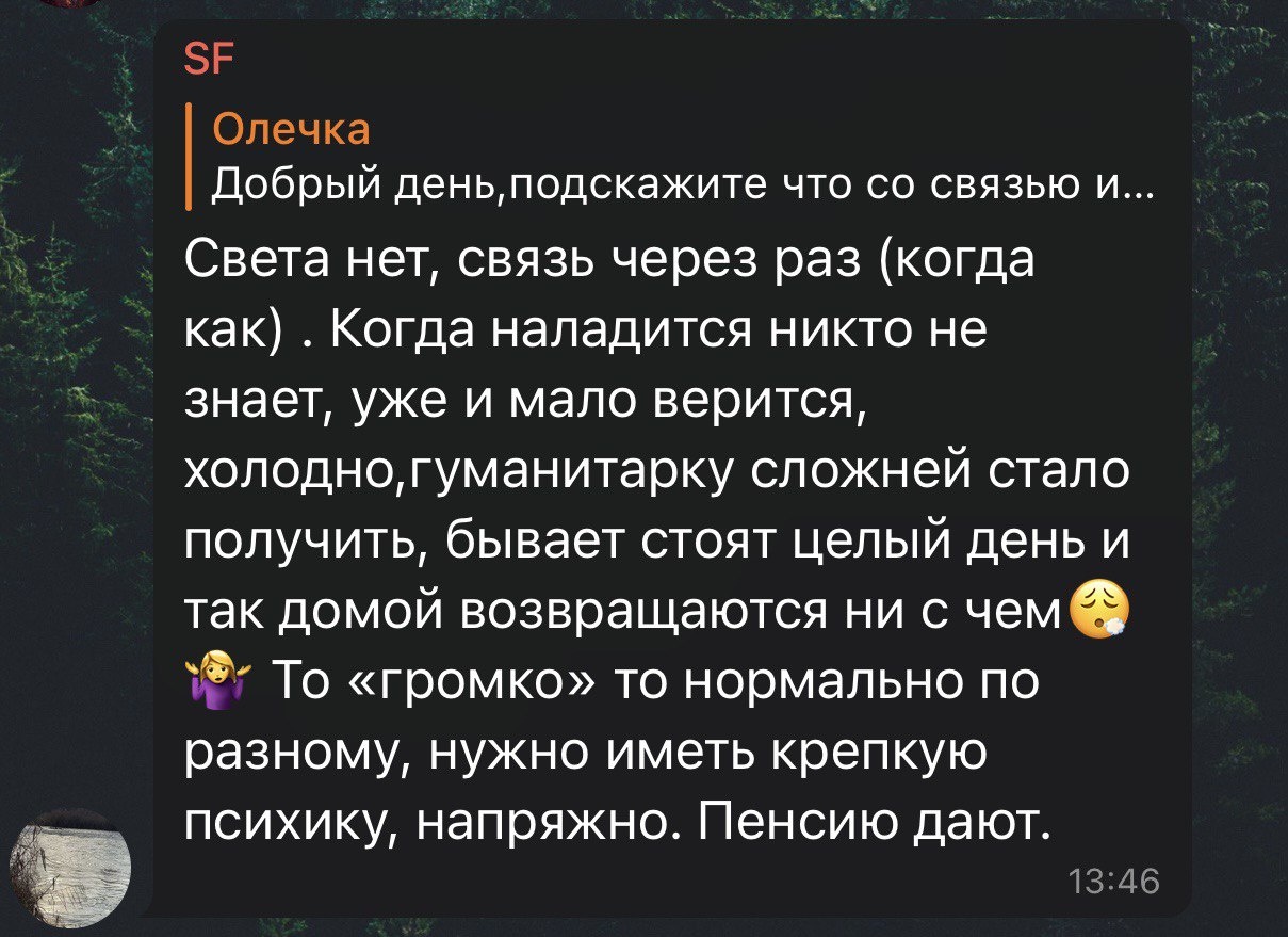 За словами користувачів мережі, з отриманням гуманітарної допомоги справи зараз погано. Іноді доводиться стояти у черзі цілий день, але в результаті можна нічого не отримати. Холодно. Світла немає. Періодично у Лисичанську буває "гучно".
