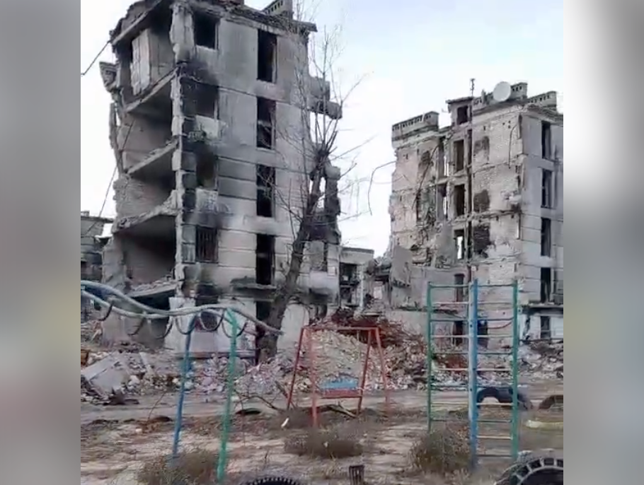 На кадрах один із дворів міста. Як можна побачити, деякі будинки зруйновані повністю. Постраждав дитячий майданчик. Біля будинків немає нікого.