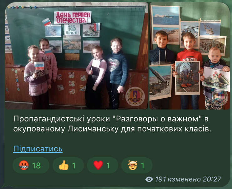 "Пропагандистські уроки "Разговоры о важном" в окупованому Лисичанську для початкових класів", - йдеться у коментарі до фото.