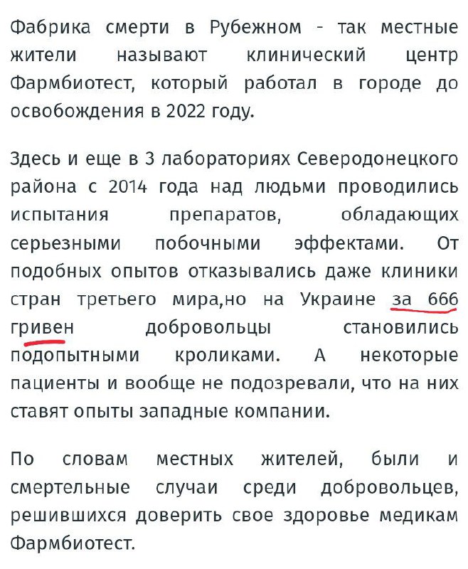 Так у росЗМІ повідомляють, що в рубіжанському клінічний центр "Фармбіотест" проводилися випробування над людьми. "За 666 гривень добровольці ставали піддослідними кроликами".