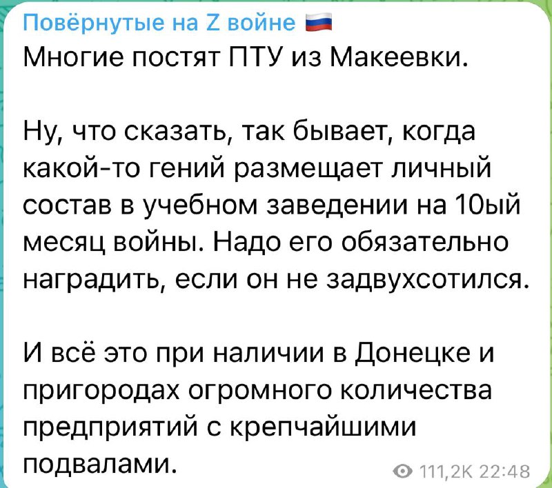 "Так буває, коли якийсь геній розміщує особовий склад у навчальному закладі на 10-й місяць війни. Треба його обов'язково нагородити, якщо він не задвохсотився. І все це за наявності в Донецьку та передмістях величезної кількості підприємств із найміцнішими підвалами. Такі втрати в тилу - як це можливо на 11-й місяць війни??? Хто керує процесом? Безмозкі олені? Шок, просто шок!", - пишуть військкори.