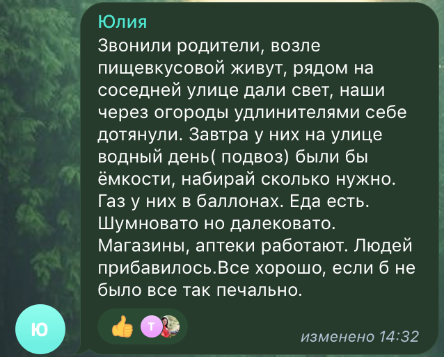 Воду підвозять, як випливає з повідомлення, у певні дні. Газ люди купують самі у балонах. Вдалині "шумновато". Якщо вірити повідомленню, людей у місті побільшало, але це не означає, що все добре.