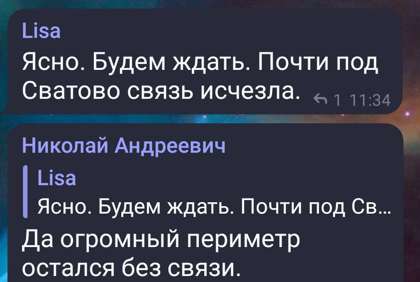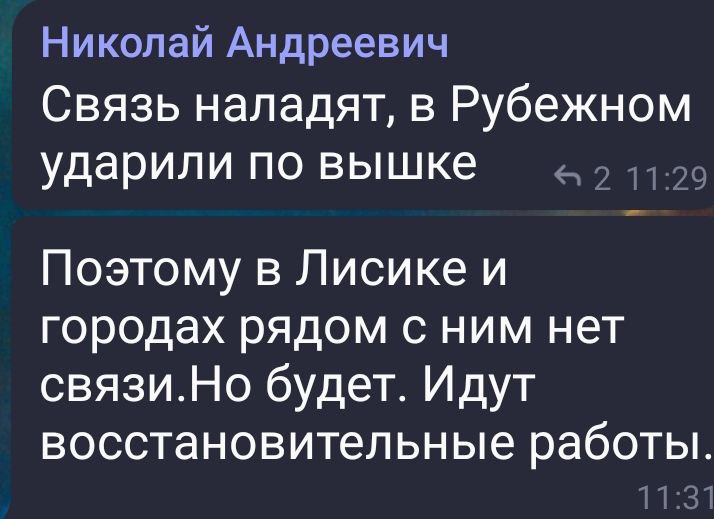 Припускають, що проблеми пов'язані з руйнуванням вежі стільникового зв'язку в Рубіжному. Через це без зв'язку залишився не лише Лисичанськ, а й Сєвєродонецьк, Кремінна. Скільки часу знадобиться на відновлення - ніхто не знає. На рівні чуток, відновлювальні роботи йдуть, проте результатів жодних поки що немає.