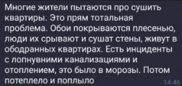 За словами користувача мережі, мешканці міста змушені зривати зі стін шпалери, аби хоч якось просушити квартири. Сирість та пліснява стали тотальною проблемою в будинках, які не опалювалися. Крім того, були випадки розриву каналізаційних труб та опалення. Весною все розтануло і попливло.