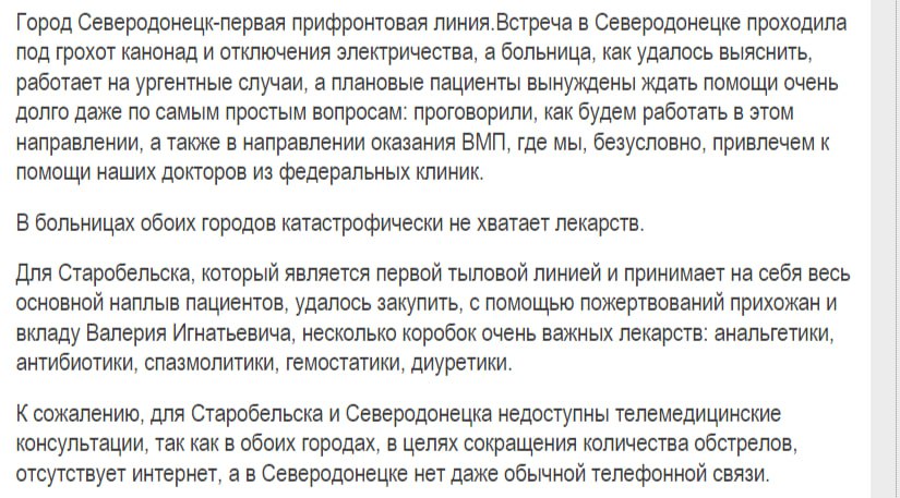 Як заявляють самі окупанти, в обох містах недоступні телемедичні консультації, "оскільки в обох містах, з метою скорочення кількості обстрілів, відсутній інтернет, а в Сєвєродонецьку немає навіть звичайного телефонного зв'язку".