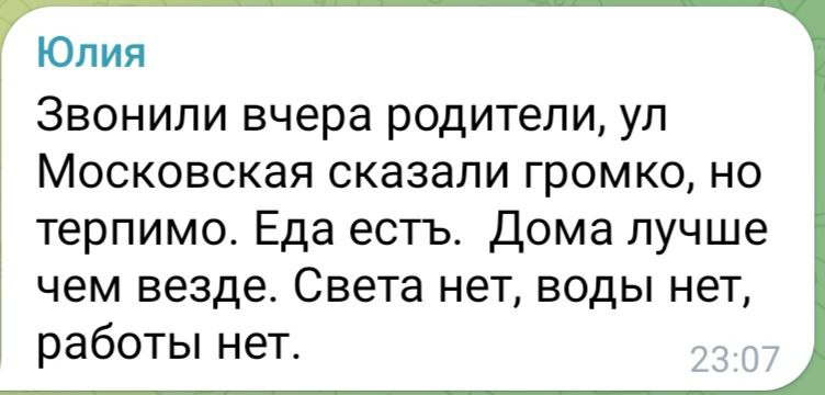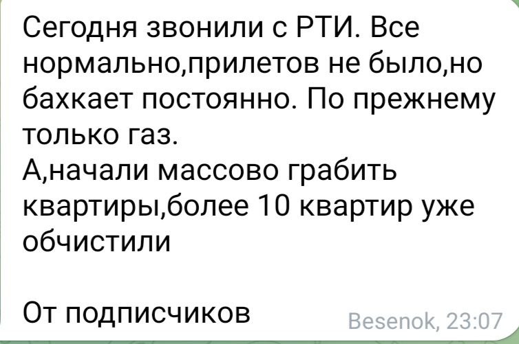 Як зазначає автор повідомлення, в районі ГТВ на цей час прильотів не було, але "бахкає" постійно. У мікрорайонах мешканцям багатоквартирних будинків доступний лише газ. Що ж до грабежів квартир - "чистять" їх масово.
