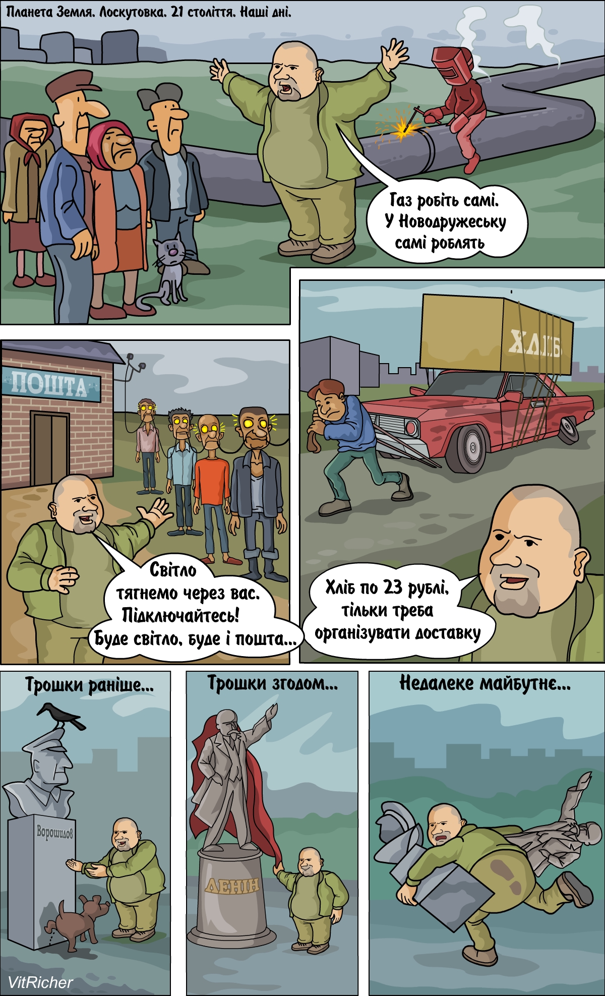 "Ми його знайшли, відмили, відчистили. Леніна ми поставимо - знайшли Леніна. Скоро ми поставимо наступні пам'ятники. Скоро Лисичанськ розквітне", - вихваляється на зустрічі з мешканцями Лоскутовки Скорий.