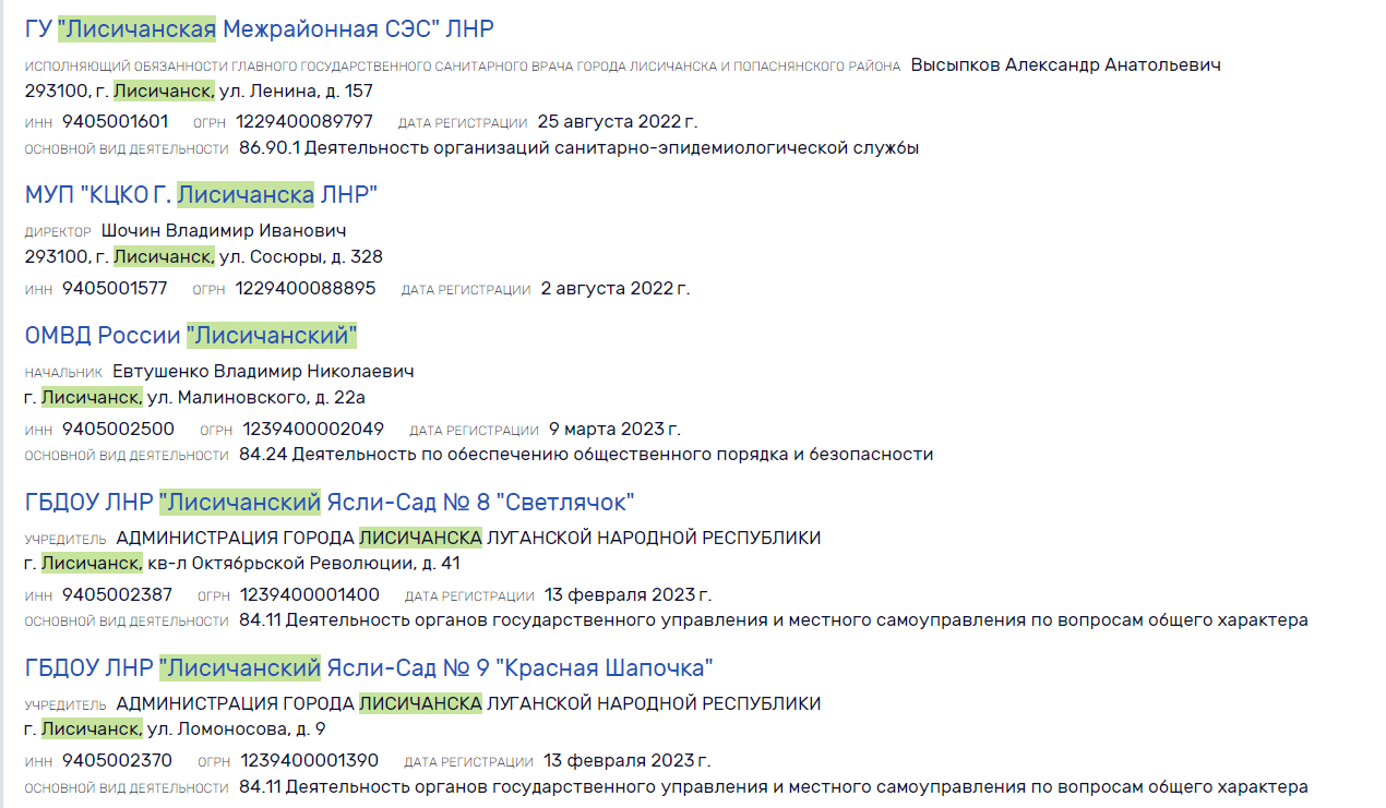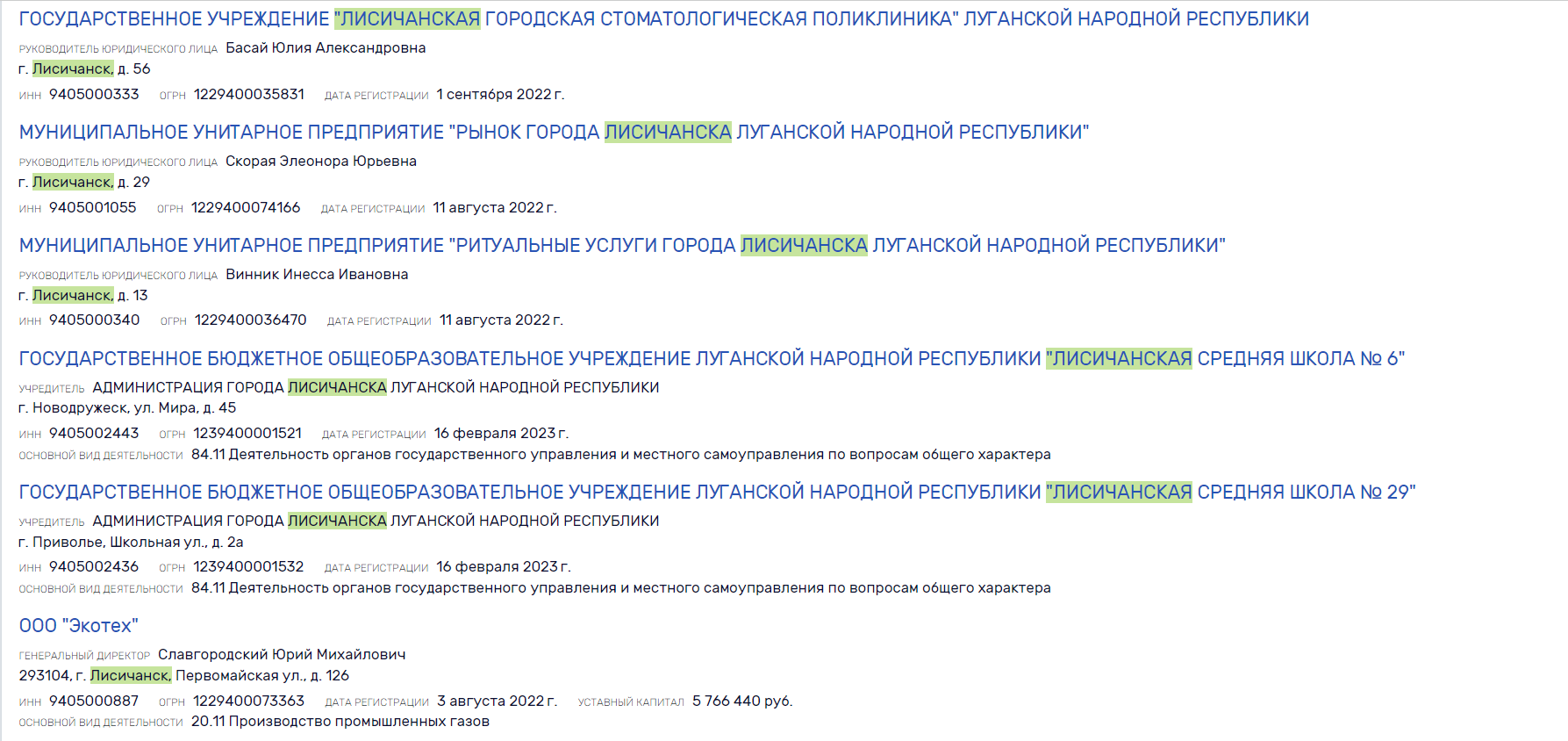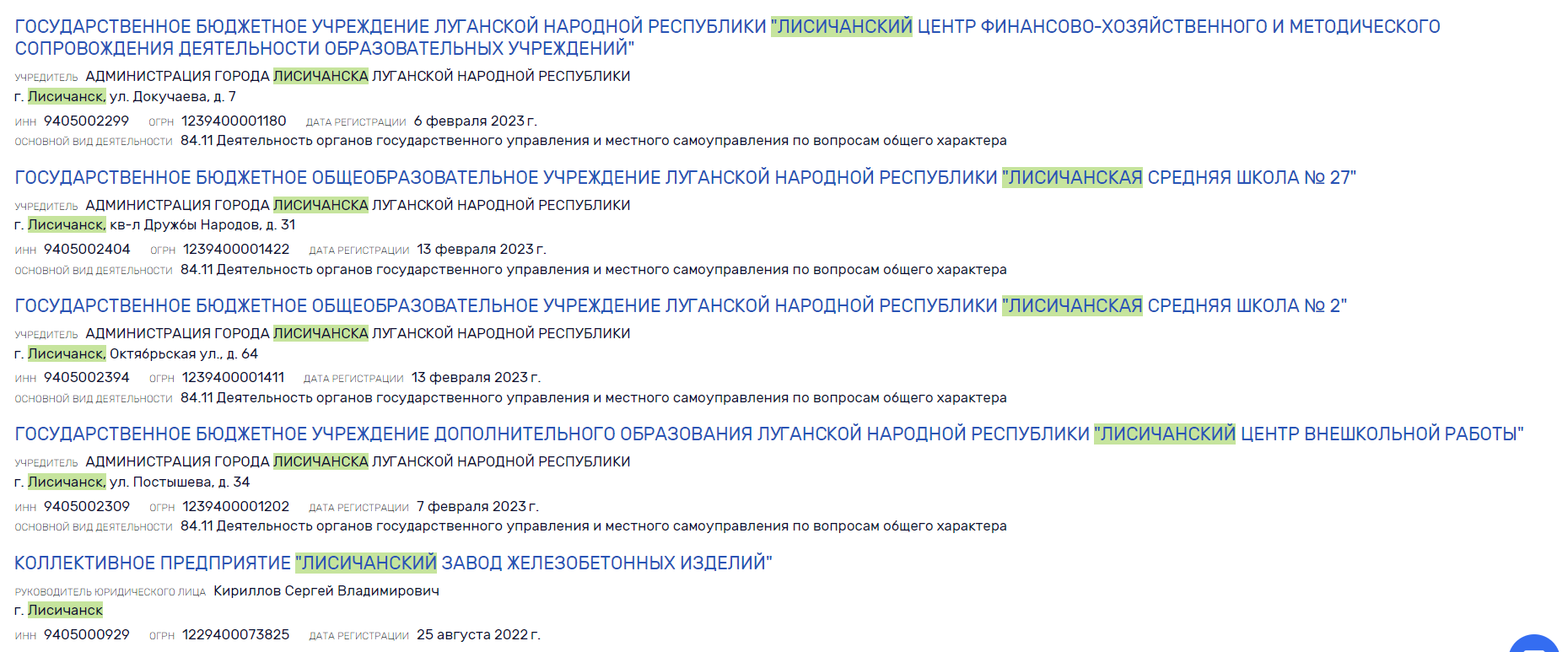 Вже кілька десятків підприємств та організацій зареєстровані за російським законодавством в Лисичанську. В місті наразі функціонує вісім шкіл та п’ять дитячих садочків. Дві школи очолюють колишні їх директори: