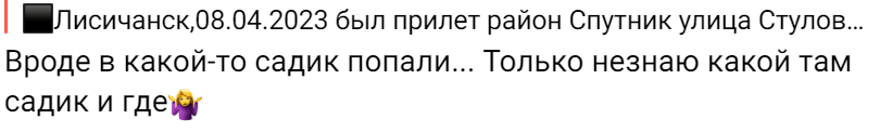 "Лисичанськ, 08.04.2023 був приліт район Супутник, вулиця Стулова (парна сторона). Жінка з пораненням у лікарні, стан не відомий", - говориться в повідомленні.