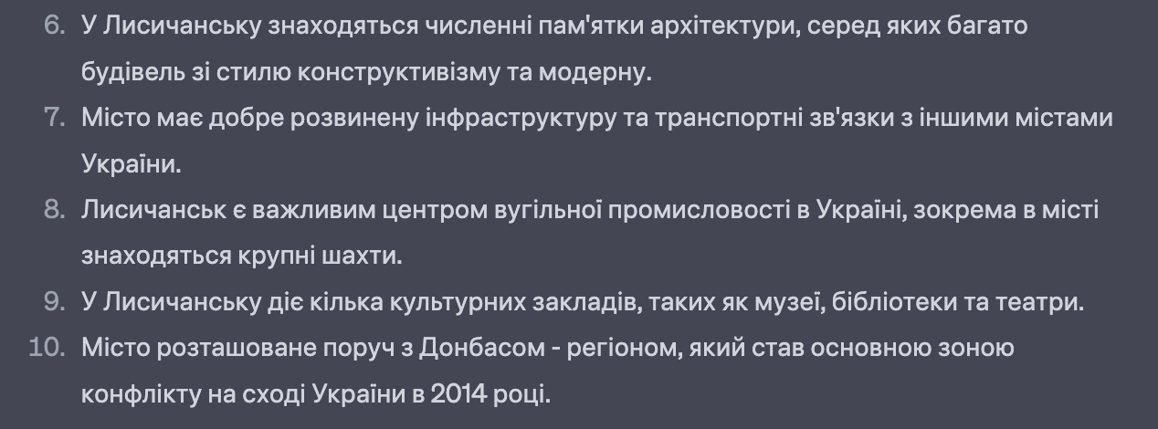 Запит, адресований нейромережі, такий: "10 цікавих фактів про Лисичанськ". Відповіді виявилися несподіваними. ChatGPT правильно "розпізнав", що Лисичанськ - це місто Луганської області. Однак самі "факти" - далеко не факти.