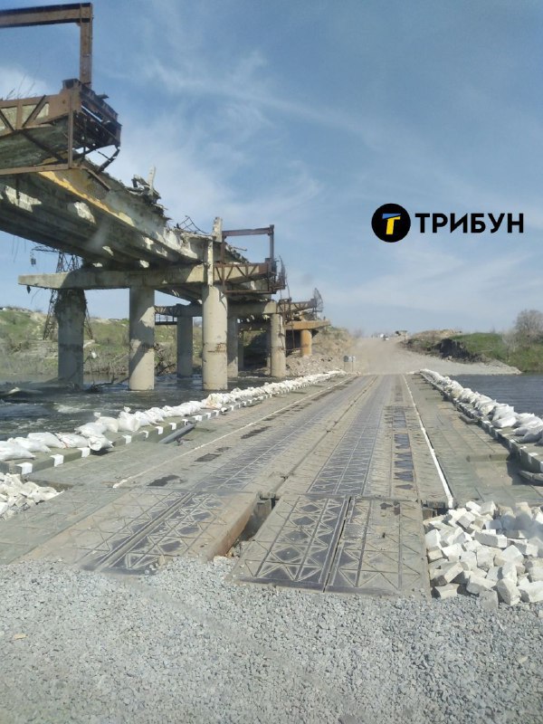 Російські окупаційні війська збудували понтонну переправу поруч із зруйнованим мостом. На місці колишньої автодороги залишилися лише стовпи та руїни.