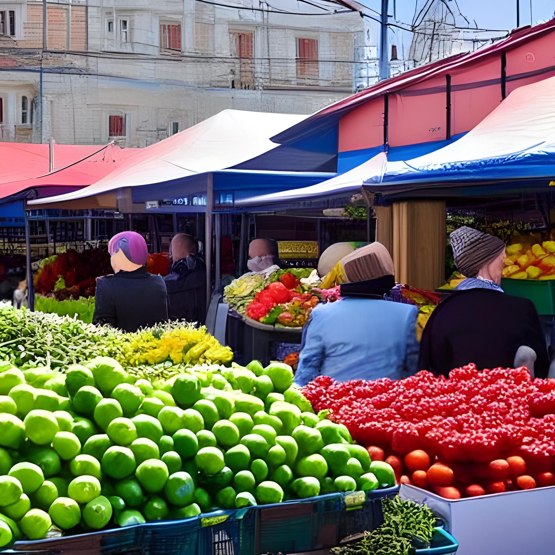 Центральний ринок Лисичанська у 2025 році нагадуватиме барвистий ярмарок овочів та фруктів. Щоправда, не зовсім зрозуміло, що за будівля красується на тлі. Можливо, не вся забудова буде сучасною, залишиться частинка звичного старого колориту.