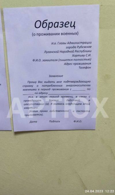 Відповідний "бланк" пропонується заповнити рубіжанам, які, судячи з усього, виявили, що хтось проживав у їхніх квартирах та витрачав електроенергію. "Зразок (проживання військових)" заповнюється на ім'я голови окупаційної адміністрації. Він передбачає подальше отримання "довідки" про споживання загарбниками електроенергії за певний період.