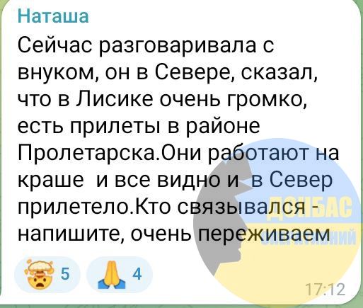 Як наголошує автор повідомлення, якій вдалось зв'язатися з родичами, в місті "дуже гучно" - "прилітає" в район Пролетарська. Вона ж пише і про можливі "прильоти" в сусідній Сєвєродонецьк.